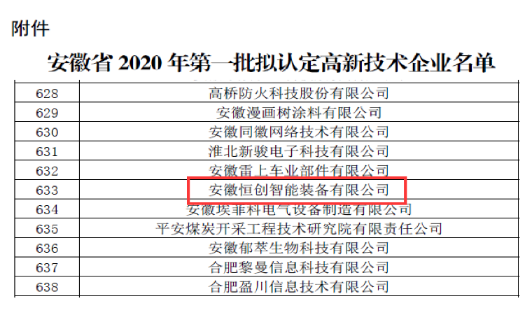 安徽恒創(chuàng)智能入圍安徽省2020年第一批2595家企業(yè)擬認(rèn)定高新技術(shù)企業(yè)名單